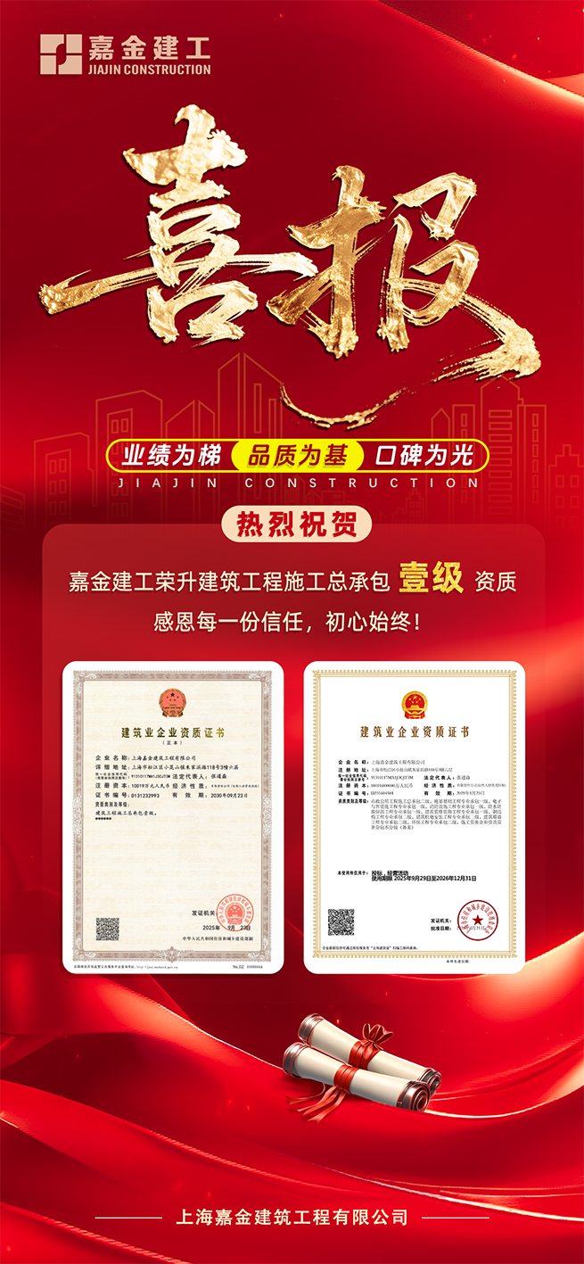 热烈庆祝上海嘉金建筑工程有限公司荣升建筑工程施工总承包一级资质!资质升级的背后,离不开每一位业主客户对嘉金的支持与信任。感恩同行,我们将以更高标准,为您筑就更优的工程!